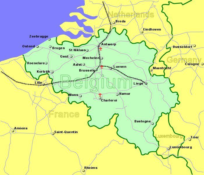 Luchthavens in België in kaart. België luchthavens kaart (West-Europa - Europa) af te drukken. België luchthavens kaart (West-Europa - Europa) te downloaden. Volgens het CIA World Factbook 2009 zijn er in totaal 43 luchthavens in België, waarvan er 27 verharde start- en landingsbanen hebben, zoals te zien is op de kaart van de Belgische luchthavens. Vliegtuigpassagiers in België kunnen gebruik maken van 5 luchthavens, waarvan de grootste de luchthaven van Brussel is. De andere luchthavens zijn de Internationale Luchthaven Oostende-Brugge, de Luchthaven Brussel-Zuid Charleroi, de Luchthaven van Luik en de Internationale Luchthaven Antwerpen. Andere luchthavens zijn militaire luchthavens of kleine burgerluchthavens zonder lijnvluchten. Bekende militaire luchthavens zijn de vliegbasis Melsbroek en de vliegbasis Beauvechain
