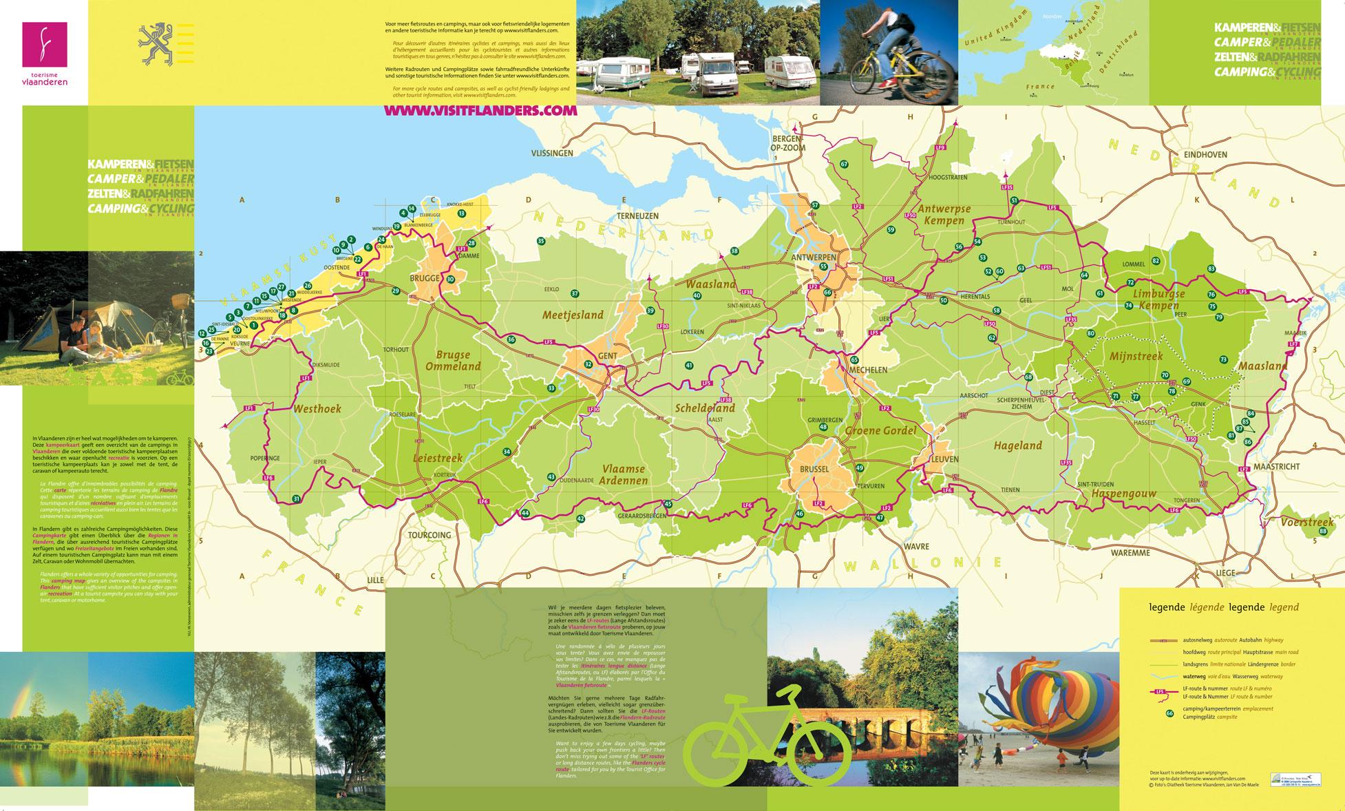 België campings op een kaart. Camping België kaart (West-Europa - Europa) af te drukken. Camping België kaart (West-Europa - Europa) te downloaden. Veel kampeerders vinden in België wat ze in eigen land missen: een vakantie in een ontspannen stemming, natuur in de vorm van uitgestrekte eeuwenoude bossen, de glooiende heuvels van de Ardennen, levendige steden, de 'Bourgondische' stijl van de Belgische keuken en de zachtmoedige aard van de mensen zelf. De ideale ingrediënten dus voor een onbezorgde kampeervakantie in een gehuurde stacaravan of in uw eigen tent of caravan. Camping Klein Strand, zoals aangegeven op de plattegrond van camping België, ligt bij Jabbeke, in de Belgische provincie West-Vlaanderen. De camping bestaat uit twee delen. Camping Goolderheide ligt dicht bij de grens met Nederland, temidden van een bos in de Belgische provincie Limburg. Camping Houtum ligt in de Belgische Kempen, vlakbij Kasterlee. Deze middelgrote camping is ideaal voor rustzoekers